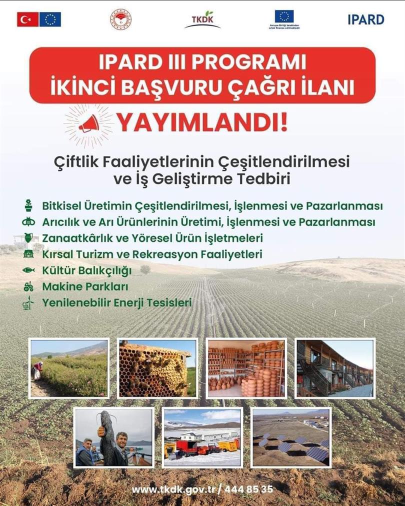 IPARD III Programı, ikinci başvuru çağrı ilanı yayımlandı. Proje Konuları ile ilgili TKDK Malatya İl İrtibat Ofisi ve tkdk.gov.tr internet sitesi üzerinden ayrıntılı bilgi alınabilir. Tüm üreticilerimize hayırlı olsun.
